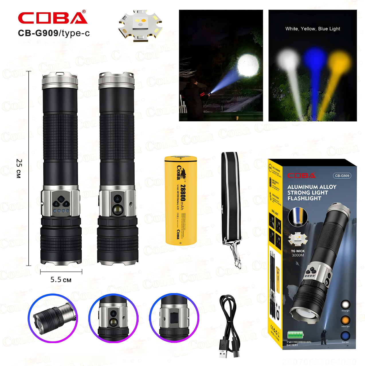 COBA CB-G909 — сверхмощный светодиодный фонарь, созданный специально для работы на открытой местности. Три режима свечения: холодный белый, мягкий желтый и специализированный синий позволяют адаптировать луч под любые погодные условия. Это высокотехнологичный продукт, который гарантирует долгий срок службы и безупречное качество сборки при сохранении доступной стоимости.