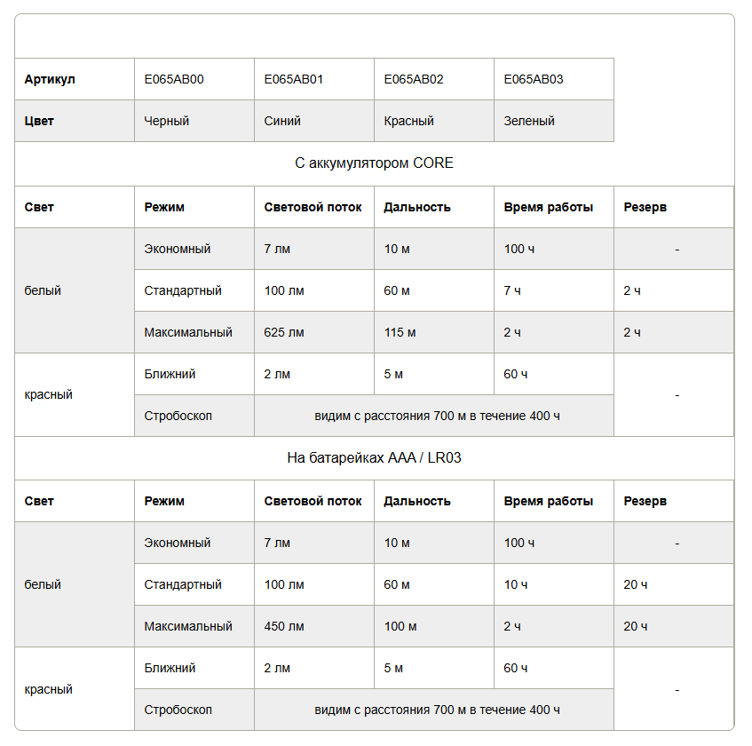 - система HYBRID CONCEPT: фонарь поставляется с аккумулятором CORE, но также может работать на трёх батарейках AAA/LR03 (в комплект не входят); автоматически определяет источник питания и регулирует световой поток