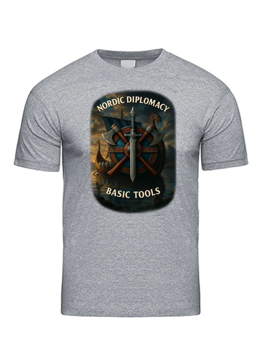 NORDIC DIPLOMACY «Северная дипломатия: основные инструменты»- перевод текста этого сюжета. Он просто отражает что в годы господства викингов в Северных европейских территориях, основная дипломатия с их стороны заключалась в набегах на чужие территории с моря и не в переговорах, а в покорении «мечом и топором», а их драккары служили средством доставки «дипломатов» к чужим берегам по воде. Сама футболка выполнена из высококачественного 100% хлопка плотностью 160 г/м. Принт нанесен по технологии, выдерживающей более 50 стирок без потери для изображения при соблюдении стандартный условий стирки и глажения подобных изделий.