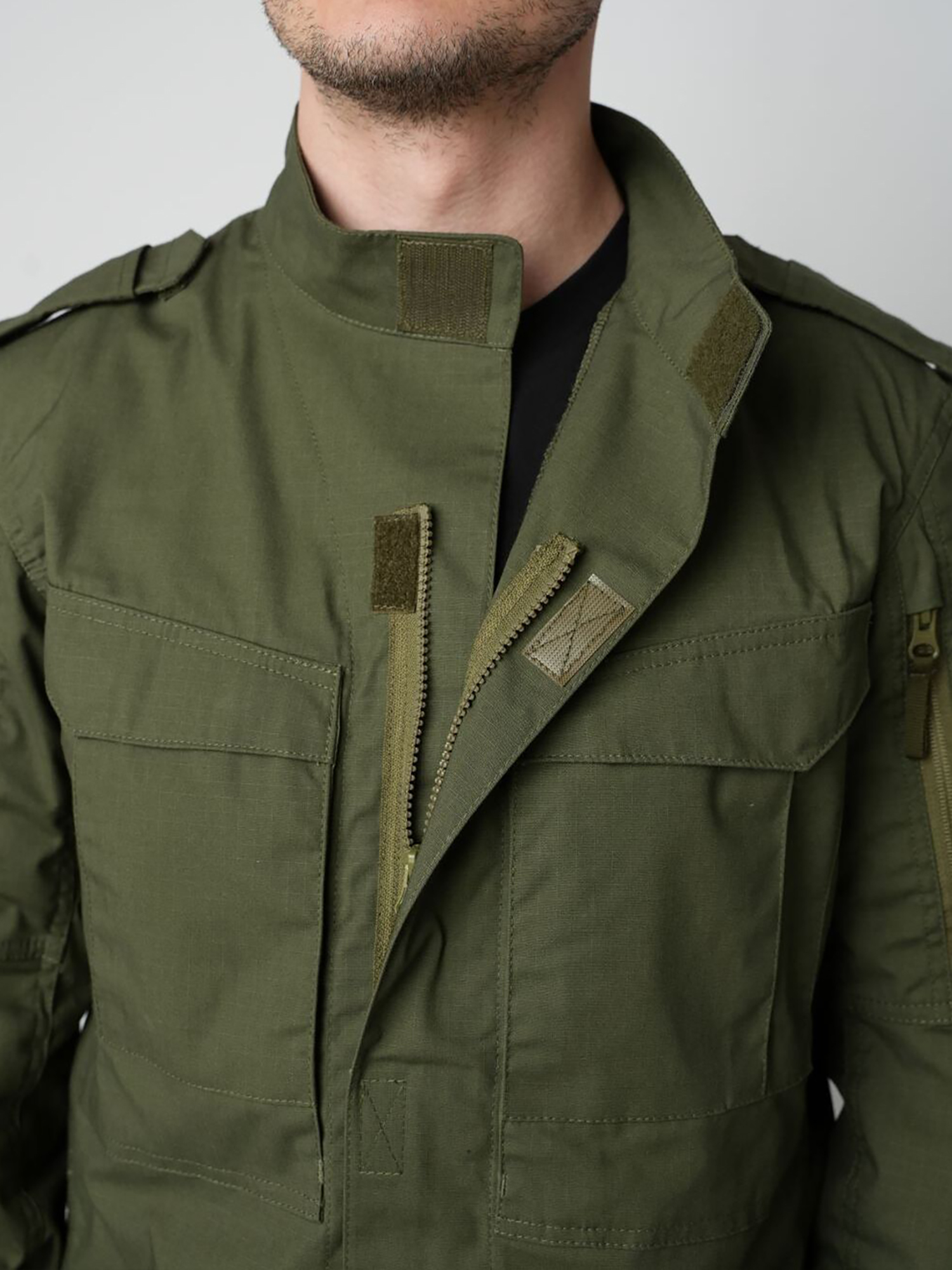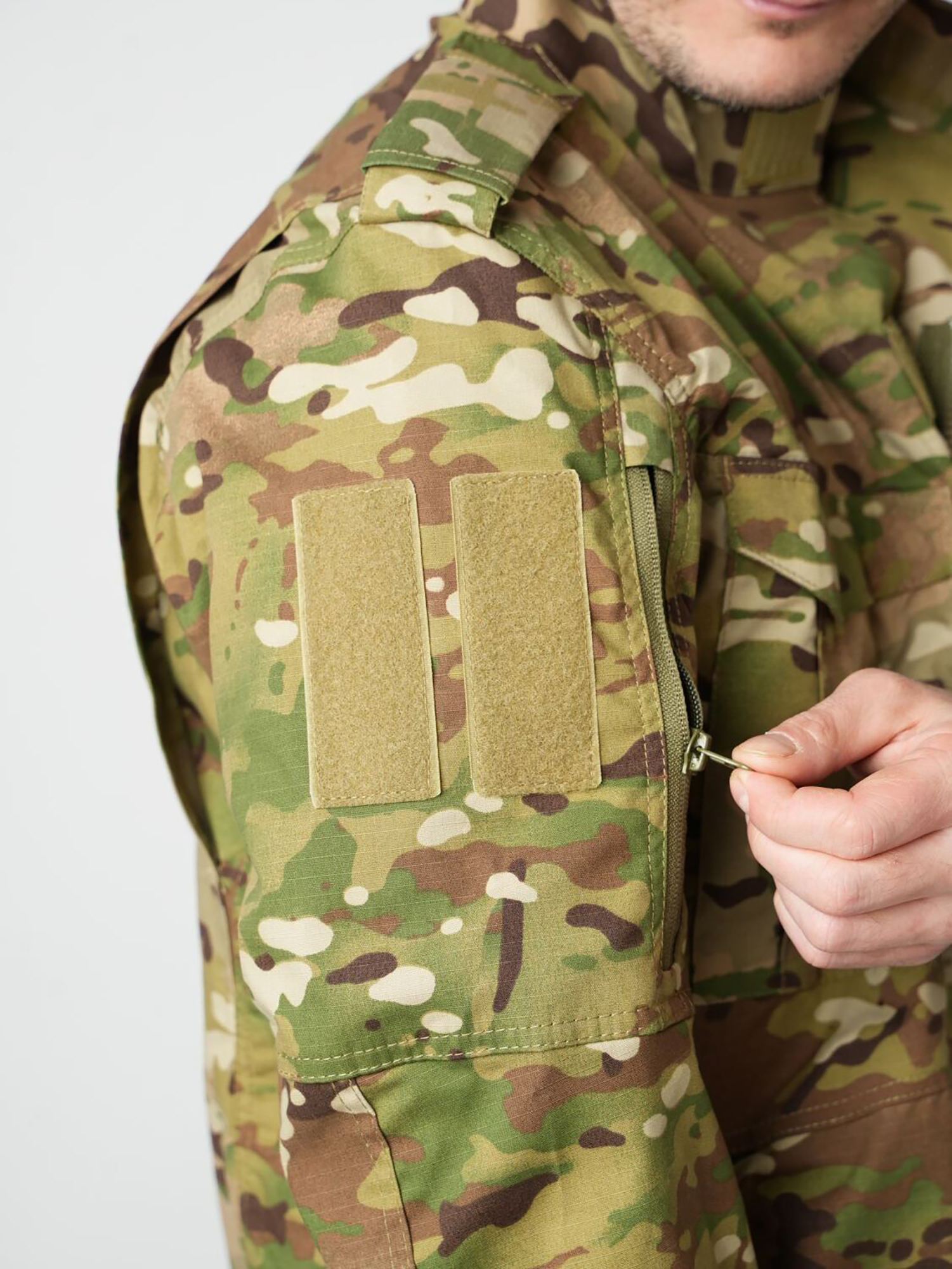 - на каждом плече накладной карман, на плечевой зоне с двухслойным клапаном, застегивающимся на застежку-липучку