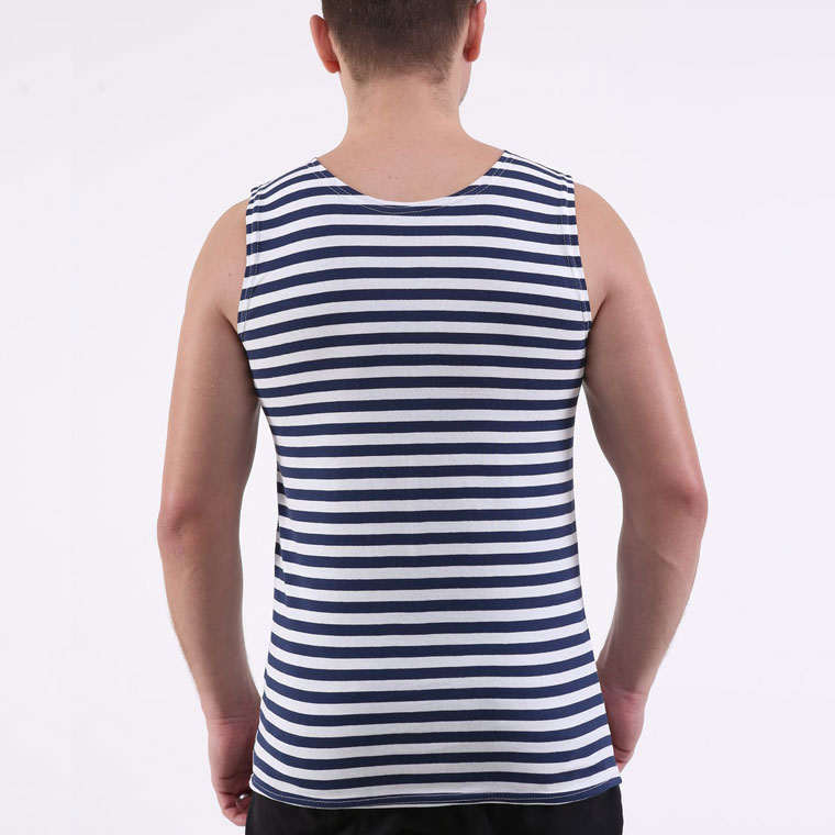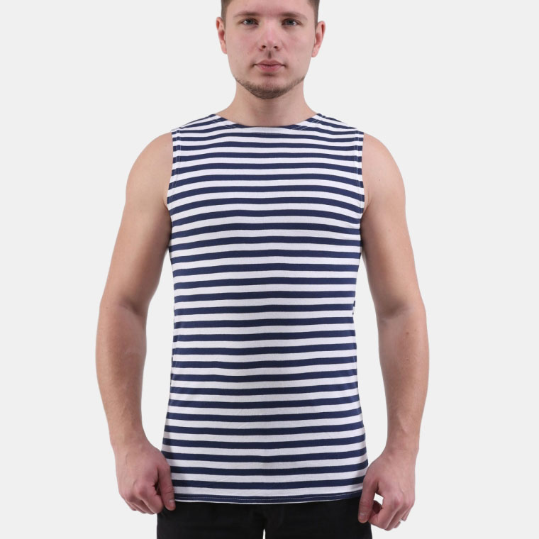 Благодаря своей прочности и гипоаллергенности тельняшки-майки получаются очень качественными и подходят людям с чувствительной кожей. В такой тельняшке-майке можно активно двигаться, отдыхать, заниматься спортом, работать, при этом влага от тела выводится через микропоры трикотажа, и верхний слой тельняшки-майки остается при этом сухим. Большую популярность тельняшке-майке принесли вышеназванные свойства, поэтому, тельняшка-майка стала очень популярным трикотажным изделием. Летняя тельняшка-майка хлопчатобумажная кулирка – хороший выбор для тех, кто любит туризм, спорт, активный отдых, дачу, охоту, рыбалку. Тельняшка-майка из 100%-го хлопка активного крашения. Сохраняет форму и цвет даже после многочисленных стирок.