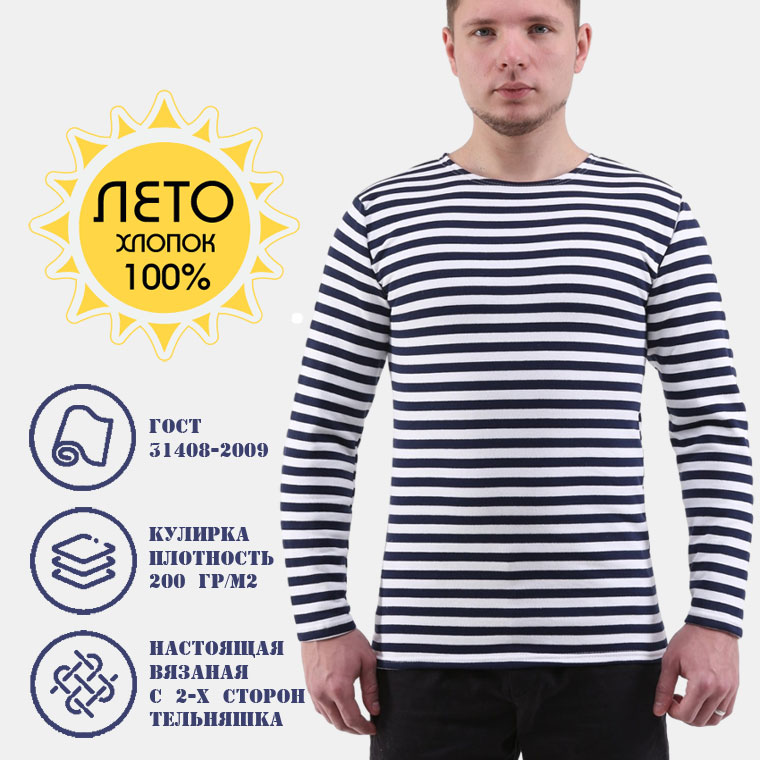Тельняшка летняя из 100%-го хлопка активного крашения. Сохраняет форму и цвет даже после многочисленных стирок.Благодаря своей прочности и гипоаллергенности тельняшки получаются очень качественными и подходят людям с чувствительной кожей. В такой тельняшке можно активно двигаться, отдыхать, заниматься спортом, работать, при этом влага от тела выводится через микропоры трикотажа, и верхний слой тельняшки остается при этом сухим. Большую популярность тельняшке принесли вышеназванные свойства, поэтому, тельняшка стала очень популярным трикотажным изделием. Летняя тельняшка хлопчатобумажная кулирка – хороший выбор для тех, кто любит туризм, спорт, активный отдых, дачу, охоту, рыбалку.